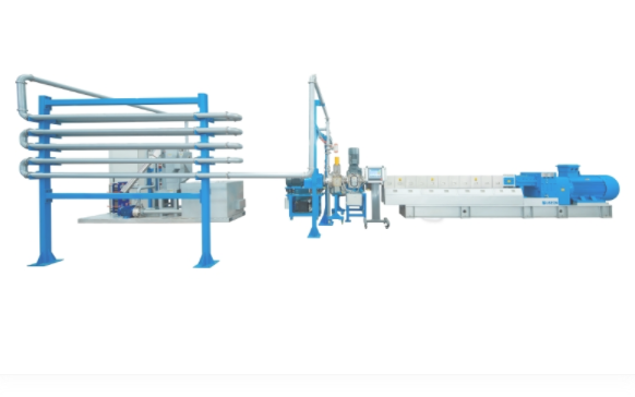 上階機(jī)為JWP系列平行同向雙螺桿混煉機(jī)。利用雙螺桿的高速、高剪切、強(qiáng)混合優(yōu)勢(shì),使物料充分完成塑化混合,由于無(wú)機(jī)頭背壓,使得我們針對(duì)不同物料靈活的排列螺桿組合,達(dá)到物料混合較好狀態(tài)。